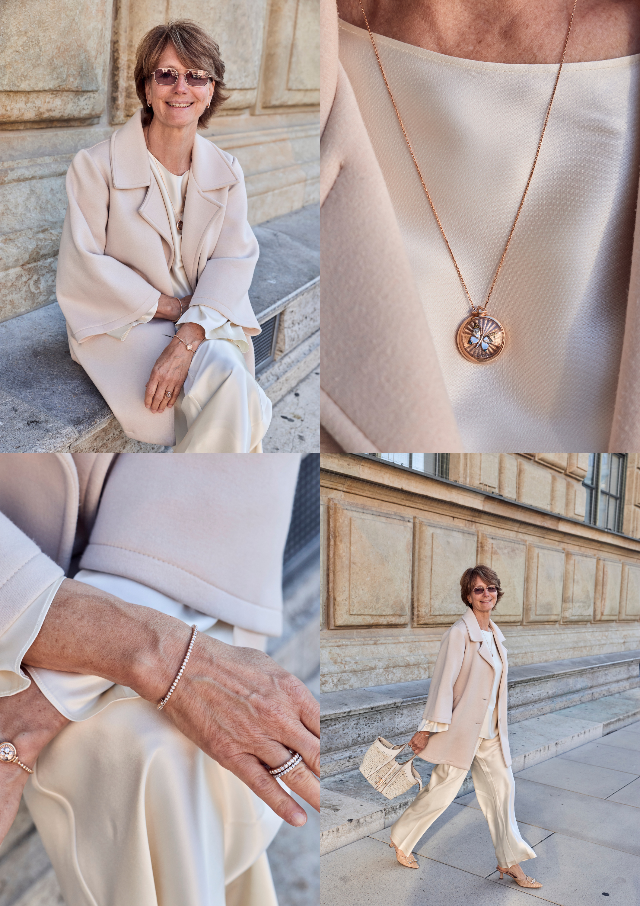 Andrea, unsere Gründerin, trägt ihre liebsten Diamantstücke aus der Grace Linie und das Dreamy Collier "Joy" mit schwebenden Diamanten. Ein zarter Schmetterling, der den Frühling symbolisiert, verleiht dem Look eine leichte, poetische Note – zeitlos, feminin und voller Strahlkraft.