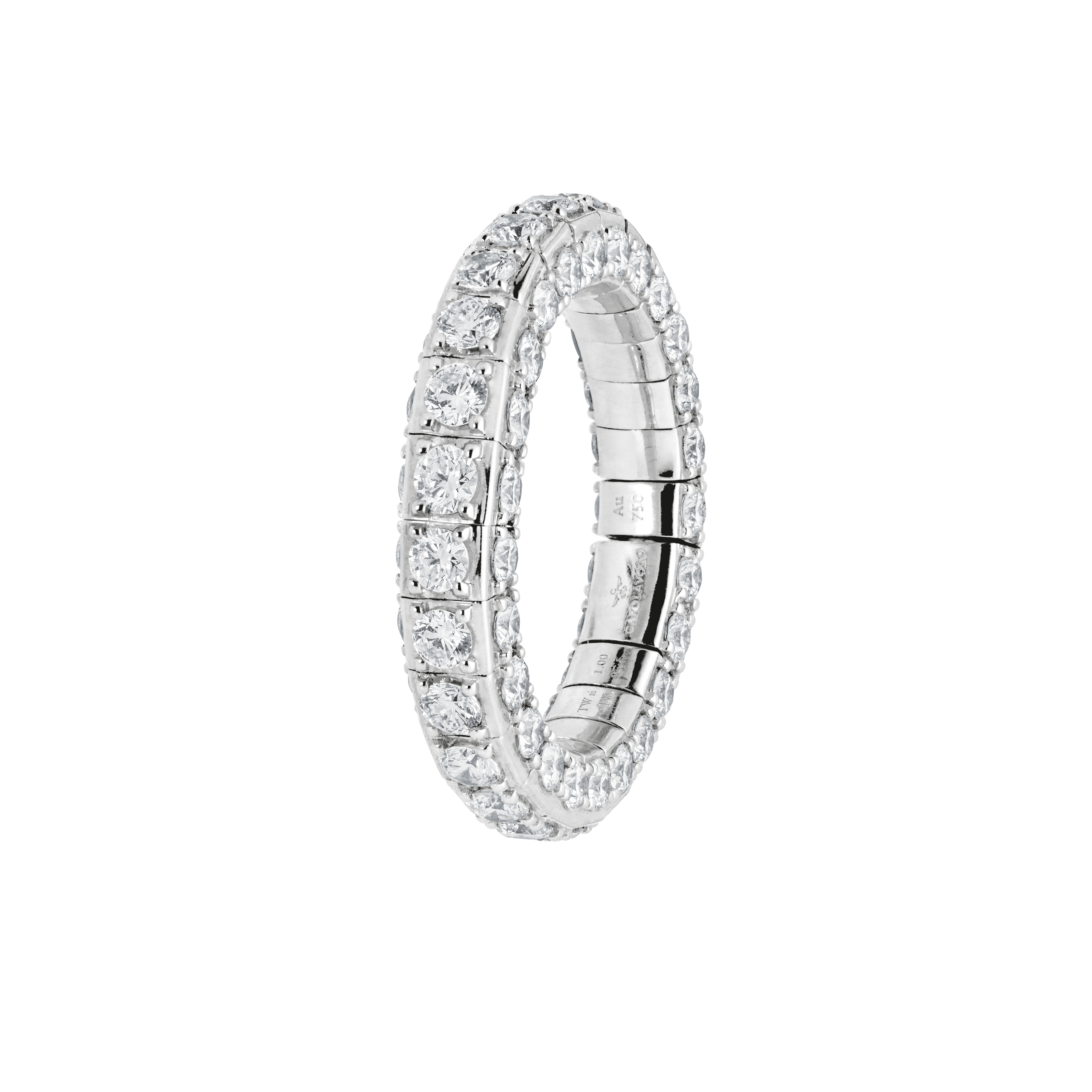 Diamonds sparkle not only on the top of the ring, but also on both sides of the design. This creates a fascinating three-dimensional play of light from every perspective and clearly distinguishes the product from classic solitaire and eternity rings.